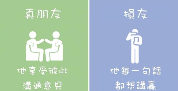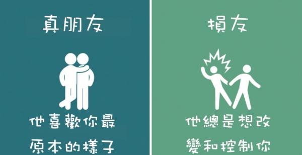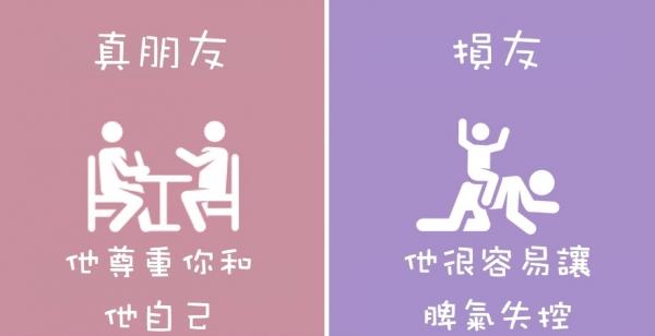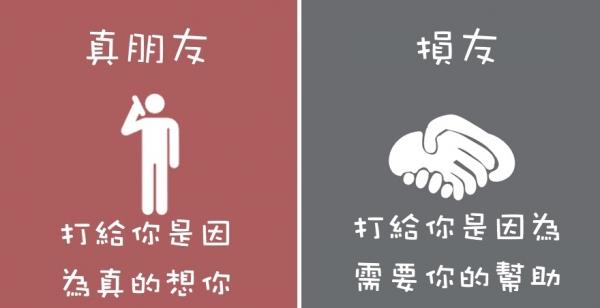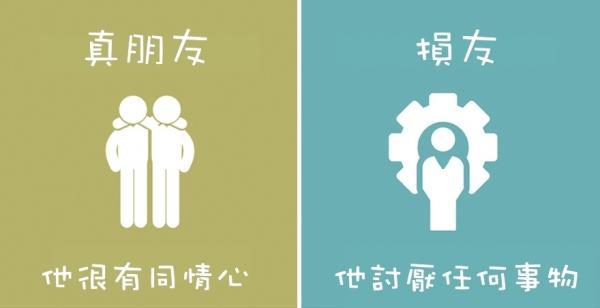 快想想看身邊的朋友們,哪些人對待你的方式是真朋友?又有哪些人對待你的方式是損友呢?當然大家都希望自己身邊的朋友都是真心的好友,但如果發現身邊都是損友的話,就該好好檢討一下囉!趕快分享出去,讓更多人看看吧!